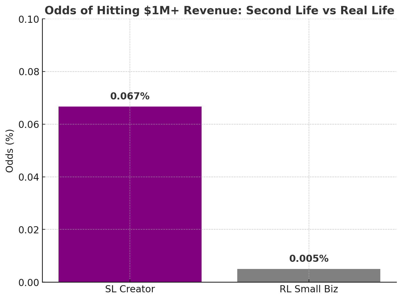 In SL, about 1 in 1,500 creators hit the millionaire mark (≈0.07%).
